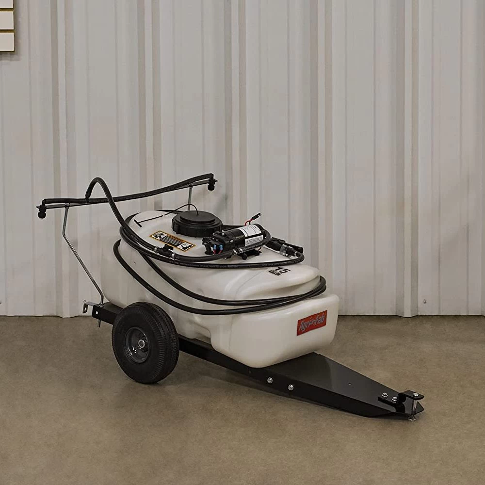 Thanks to its sturdy axle and large 10″ pneumatic tyres, the Agri-Fab 45-0588 will easily handle rough terrain. The inclusion of ample wiring ensures you’ll have no trouble hooking it up to your tractor battery. A handy on/off control stops the battery draining when the sprayer is connected but not in use.