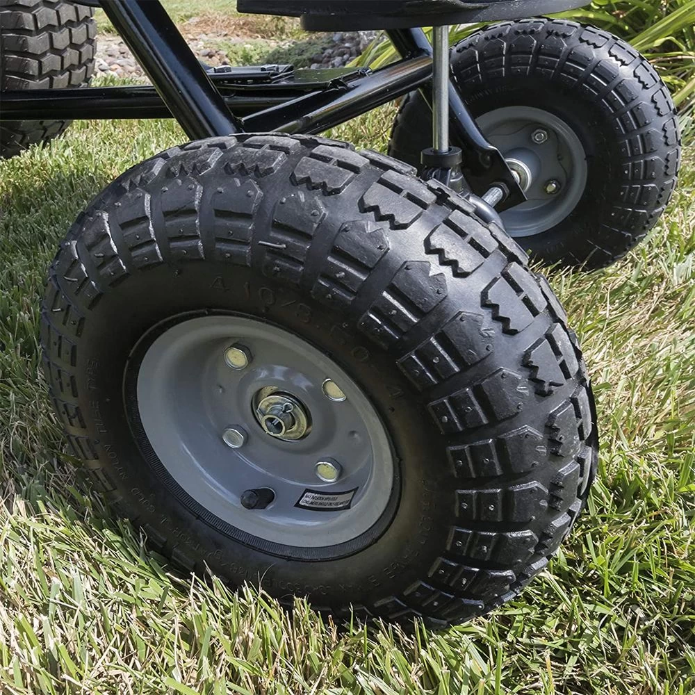 The tyres are fully pneumatic to help handle uneven ground and measure 10″ x 4″ offering good support and traction in all conditions. The sturdy axle is made from ½” tubular steel as is the metal frame. The spreader plate and premium-grade steel agitator are rust proof, ensuring easy cleaning and longer product life.