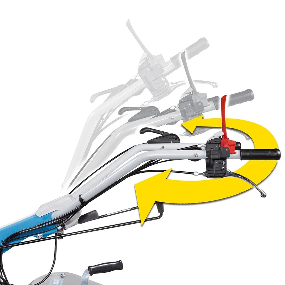 The handlebars feature vertical and horizontal adjustment and are 180° reversible, with a vibration-damping device to ensure more comfortable handling. The ergonomic handling system (EHS) ensures ease of use and reduced effort.
