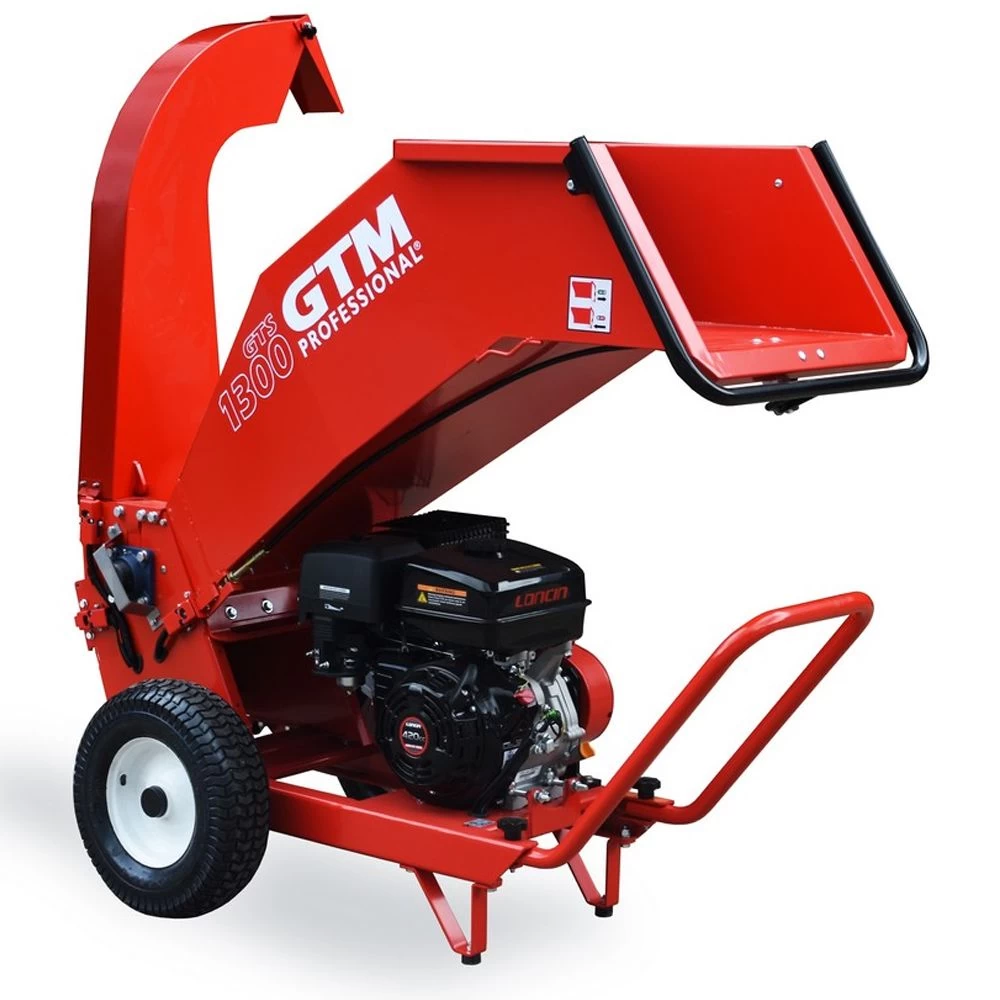 This compo wood chipper is equipped with a powerful recoil start 420cc Loncin G420F motor and an efficient rotor shredding system. This system consists of a rotor with two PRO blades that rotate along the counter blade at high speed. GTM’s high-alloy PRO blades have an extra long life and have two cutting edges so they can be turned over for reuse.