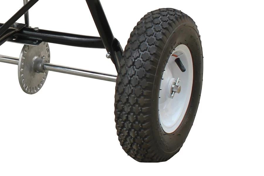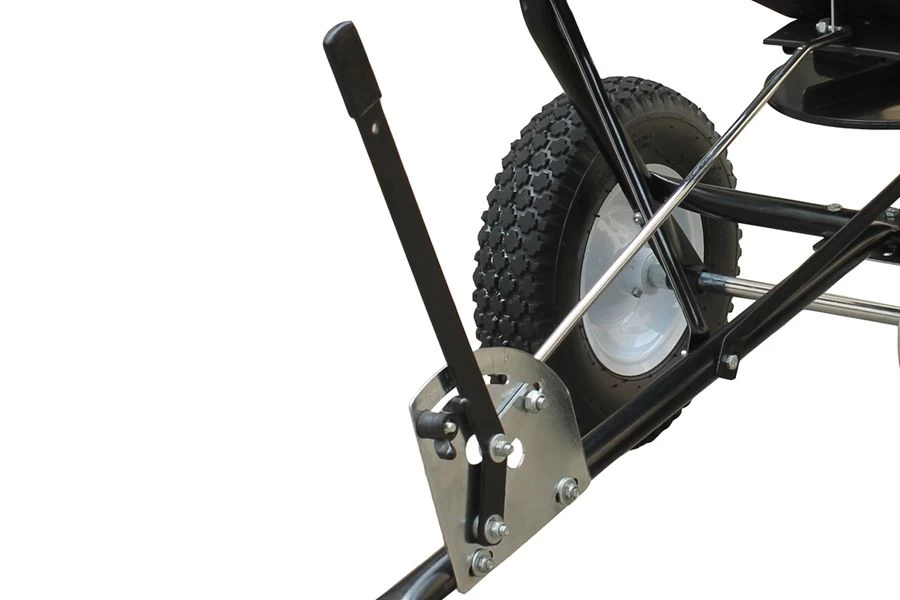 The poly hopper and the spreader plate are rust-proof ensuring long life. The flow lever can be easily operated from the driver’s seat. The pneumatic tyres ensure this spreader can be easily towed behind most tractors with a tow bar and, thanks to its rain cover, materials are kept dry.