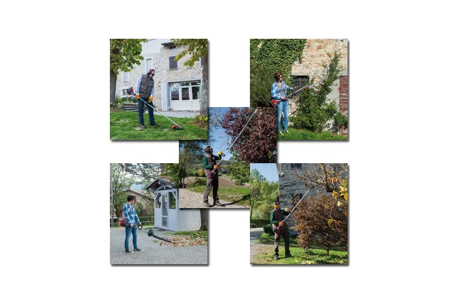 Each element of the multi-tool system: the power unit, brush cutter attachment, hedge trimmer attachment, pole pruner attachment, leaf blower attachment and extension shaft can be purchased separately as the need arises. Using just one power unit in the form of a 22cc or 30cc two-stroke engine for all applications means simplified maintenance and refuelling of just one tank, while simultaneously reducing the space required for transport or winter storage.