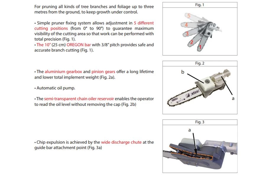 The Oleo-Mac pruner attachment is both practical and manoeuvrable thanks to an optimal ratio between weight and balance.The versatile pruner attachment makes it possible to prune branches and bushes of all types up to three metres in height, ensuring healthy growth and vegetation. Equipped with an Oregon 25cm (10″) blade, the pole pruner can be adjusted through five positions from 0 to 90 degrees to allow a better view of the cutting area.