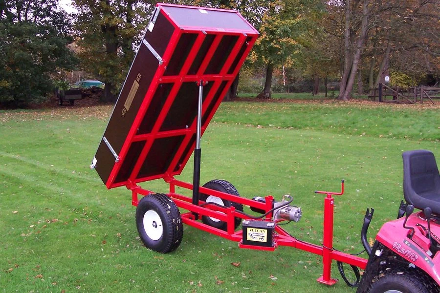 The electric hydraulic tipping trailer has been designed for use behind compact tractors, ATVs and ride-on mowers that lack hydraulic lines.