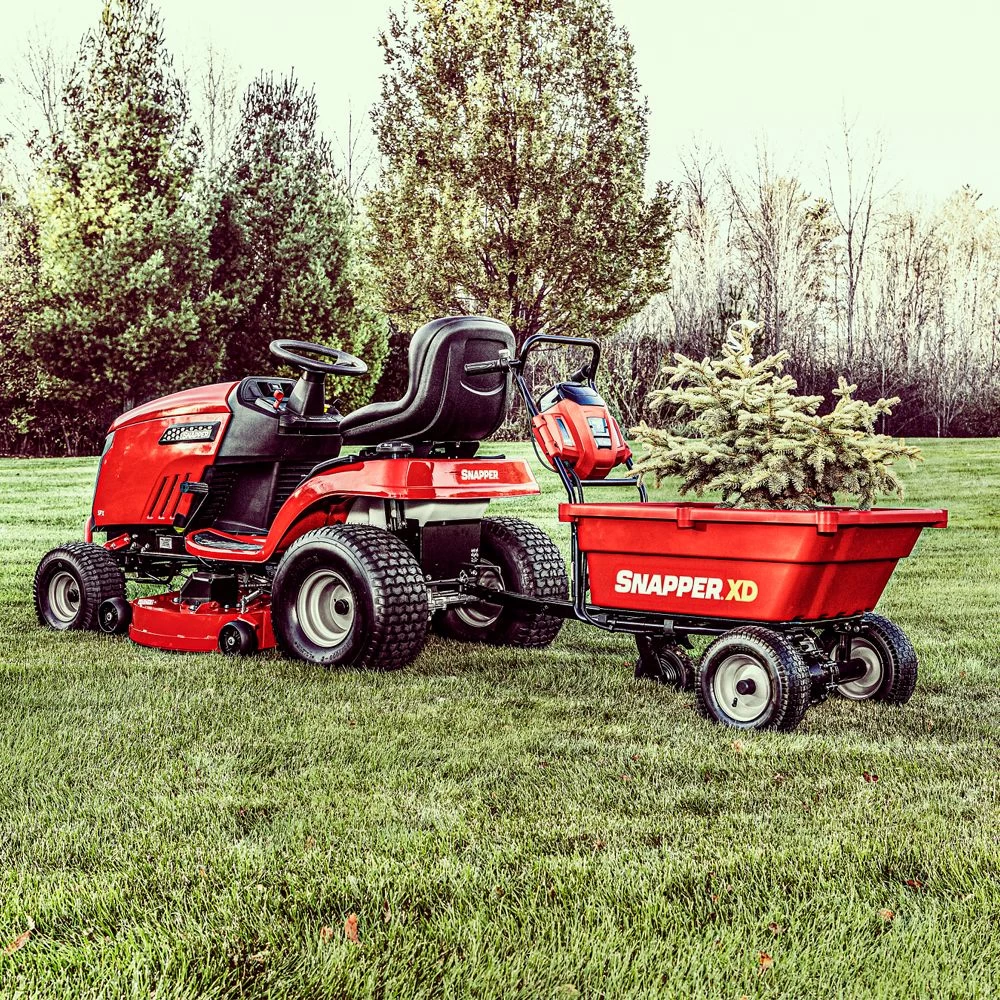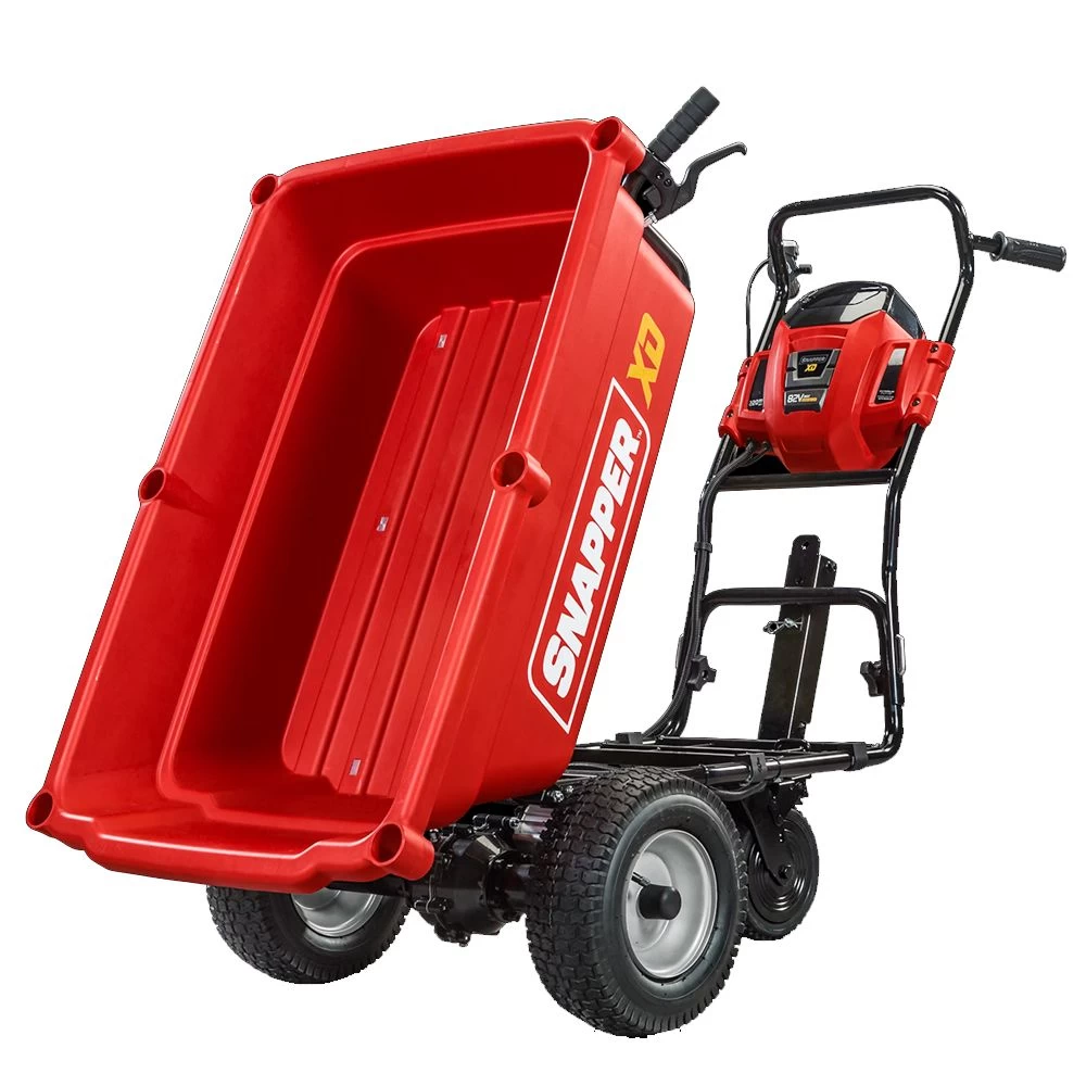 The Snapper ESXDU82 is a practical, self-propelled, battery-powered utility cart that be pushed or towed behind a lawn tractor, thanks to its foldable drawbar.
