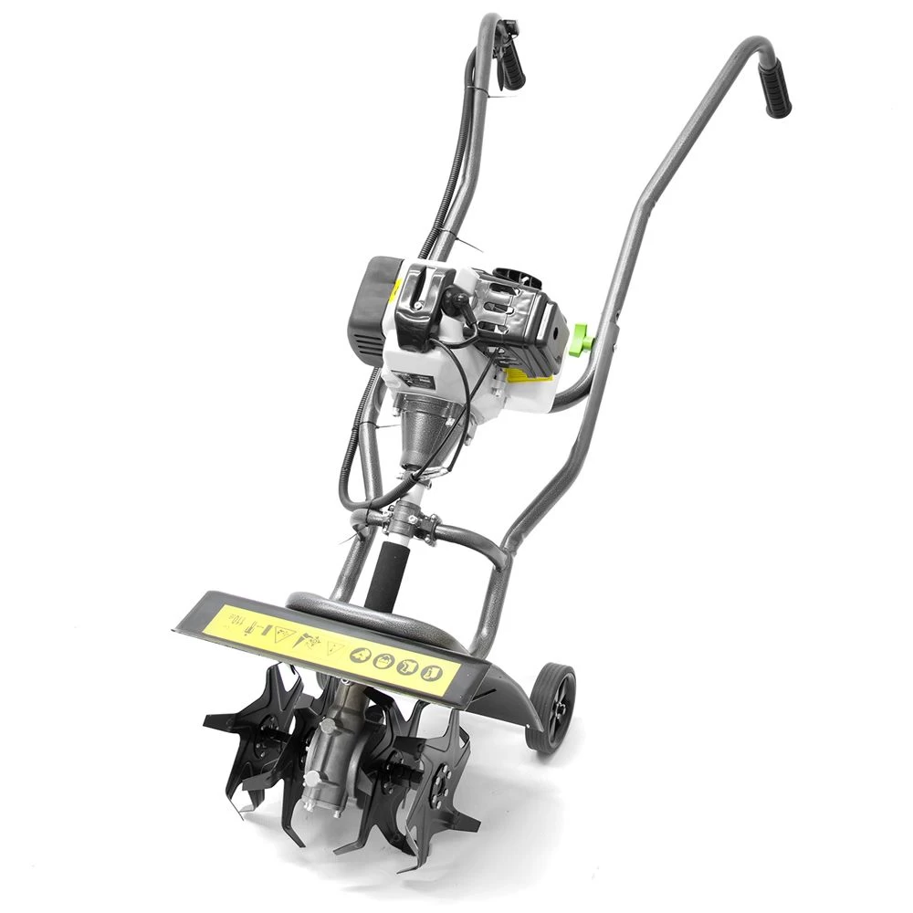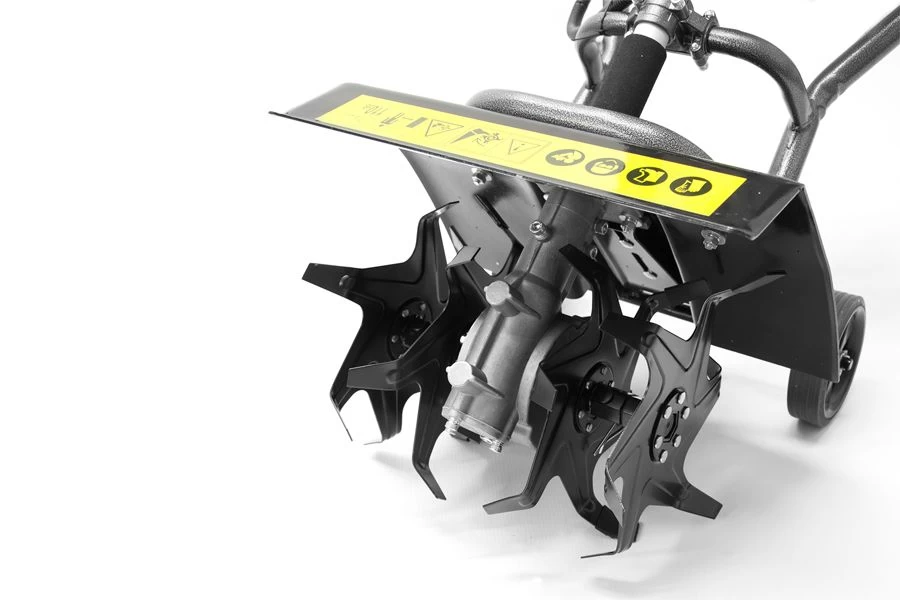 Lightweight at just 15kg, the mini tiller features wheels for easy transportation and folding handles for compact storage.